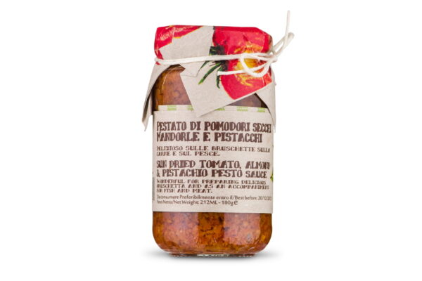 Bardzo oryginalne połączenie smaków i tekstur czyni tę pastę wyjątkową w smaku. Pomidory pochodzą wyłącznie z włoskich upraw. Użyj pasty do posmarowania ulubionego pieczywa, grzanki lub krakersa. Możesz wykorzystać ją jako pesto, dodając do świeżo ugotowanego makaronu. A może masz chęć na faszerowaną mięsną pieczeń? Nic prostszego jeśli masz nasze pestato.