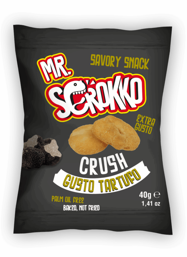 Snacki Mr.Scrokko o smaku trufli to smakowite, chrupiące przekąski w kształcie spłaszczonego taralli z dodatkiem posypki, nadającej intensywny smak trufli. Jest to praktyczna, szybka przegryzka na każdą okazję.