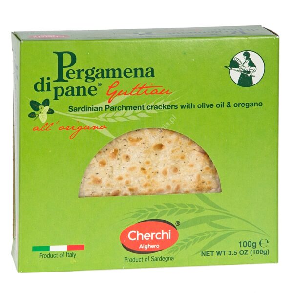 Włoski chlebek z Sardynii z oregano pergamena di pane to lekko zmodyfikowana wersja słynnego sardyńskiego pane carasau. Pergamena di pane ma podobny skład, ale jest jeszcze bardziej cienki i delikatny, niż tradycyjny pane carasau. Dosłownie przypomina pergamin.