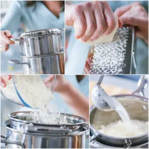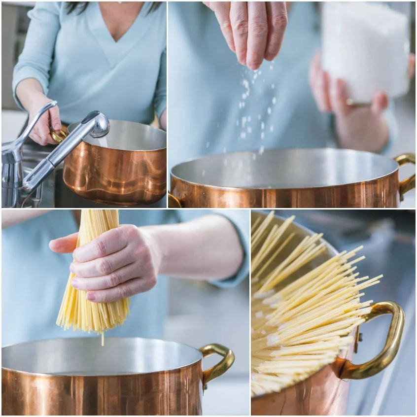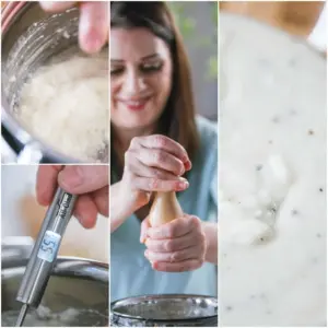 A teraz uwaga!!! Jeśli chcesz zamiast zwyklej wody, dodać wodę z gotowania makaronu (często kucharze stosują taką metodę ze względu na skrobię, która po ugotowaniu makaronu ma właściwości zagęszczające) musisz być bardzo czujny, bo skrobia, dodana do pecorino, z długimi łańcuchami glukozy, zaburza tendencję białek do koagulacji, co wpływa na moment pojawienia się grudek.