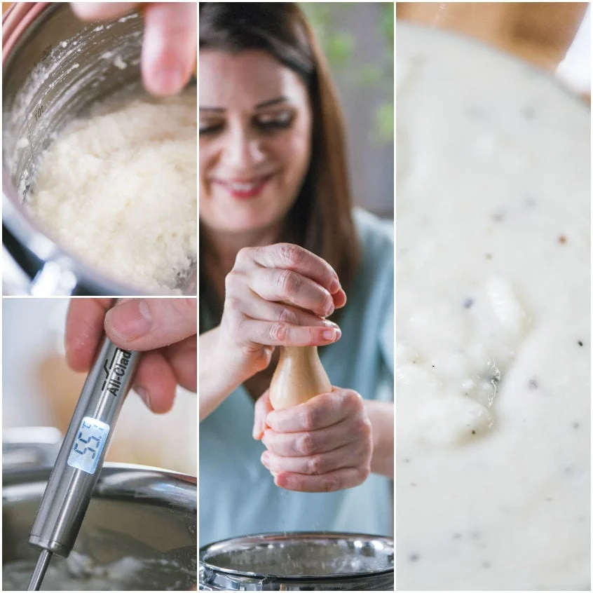 Podgrzewasz mieszając aż do uzyskania temp 55 °, dalej nie idziesz!!!. Jeśli nie masz termometru ale za to dysponujesz dobrym wzrokiem i refleksem, kończysz proces w chwili, kiedy sos jest idealnie gładki, bez żadnych grudek. Teraz sos obficie posypujesz świeżo zmielonym pieprzem.